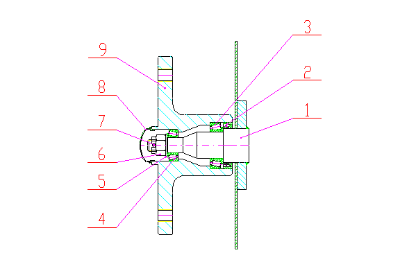 1/ hřídel zadního kola 2/ těsnící gufero 3/ vnitřní velké kuželové ložisko 4/ vnější malé kuželové ložisko (typ LM11749 17,5x40) 5/ podložka 6/ korunová matice 7/ pojistná závlačka 8/ prachotěsná poklička 9/ těleso náboje