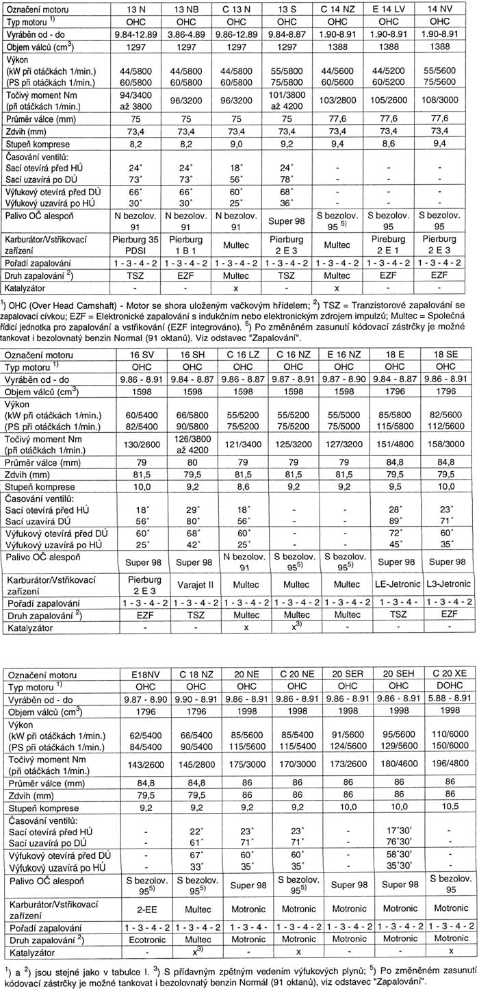 | označení motoru | 12SC | C14NZ | 14NV | TC4 EC1 | C16NZ | 16SV | 17D | C18NZ | 18SE | C20NE | 20NE | 20SEH | C20XE | 20XEJ |