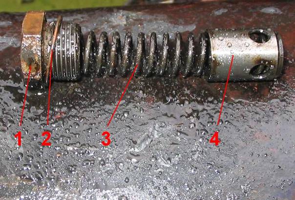 1/ krycí zátka 2 /těsnící podložka 3/ pružina 4/ pístek